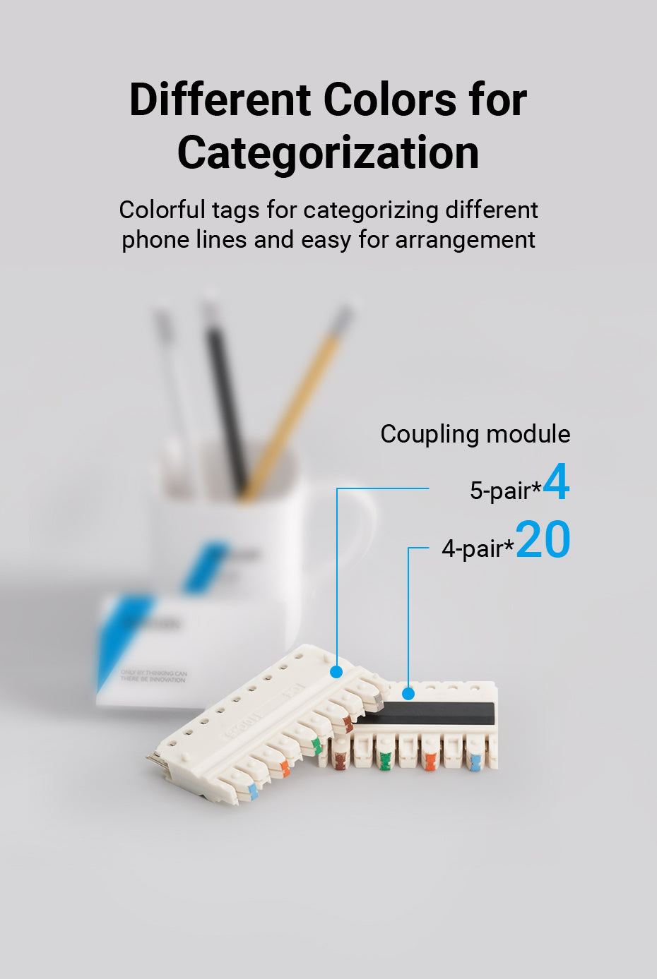 Categorización simplificada: Equipado con etiquetas de colores, categorizar las diferentes líneas telefónicas resulta sencillo, lo que facilita su gestión y organización. El panel de conexión incluye módulos de 4 pares (20 unidades) y de 5 pares (4 unidades) para aplicaciones versátiles.