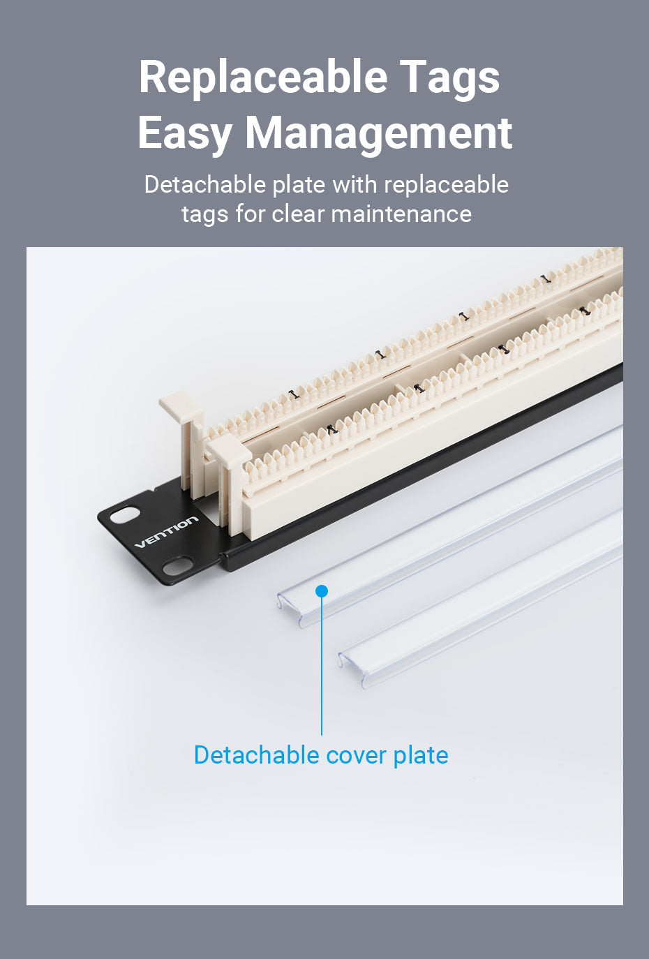Etiquetas reemplazables: El panel viene con una placa desmontable y etiquetas reemplazables, lo que hace que el mantenimiento sea simple y claro.