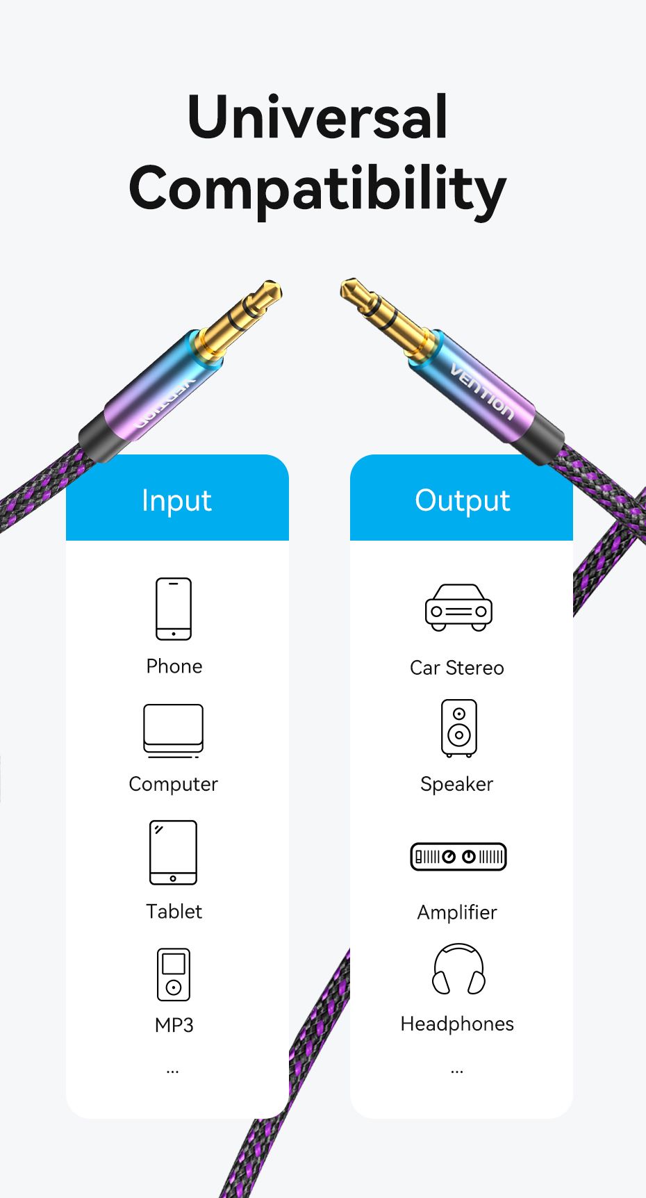 Kesederhanaan bertemu dengan fleksibilitas dengan Vention Kabel Audio 3,5 mm memiliki kompatibilitas universal dan fungsi plug-and-play. Hubungkan ponsel pintar, tablet, pemutar MP3, laptop, atau perangkat lain dengan jack audio 3,5 mm ke berbagai pilihan mendengarkan. Nikmati suara yang lebih keras melalui stereo mobil, sistem home theater, speaker portabel, atau nikmati alunan musik dengan headphone favorit Anda. Tanpa driver, tanpa perangkat lunak, hanya kepuasan audio murni dengan plug-in sederhana.
