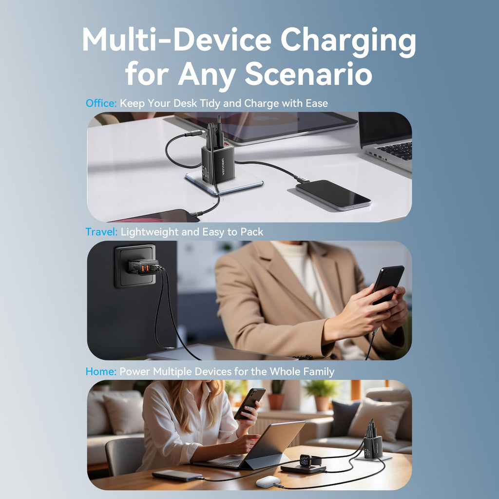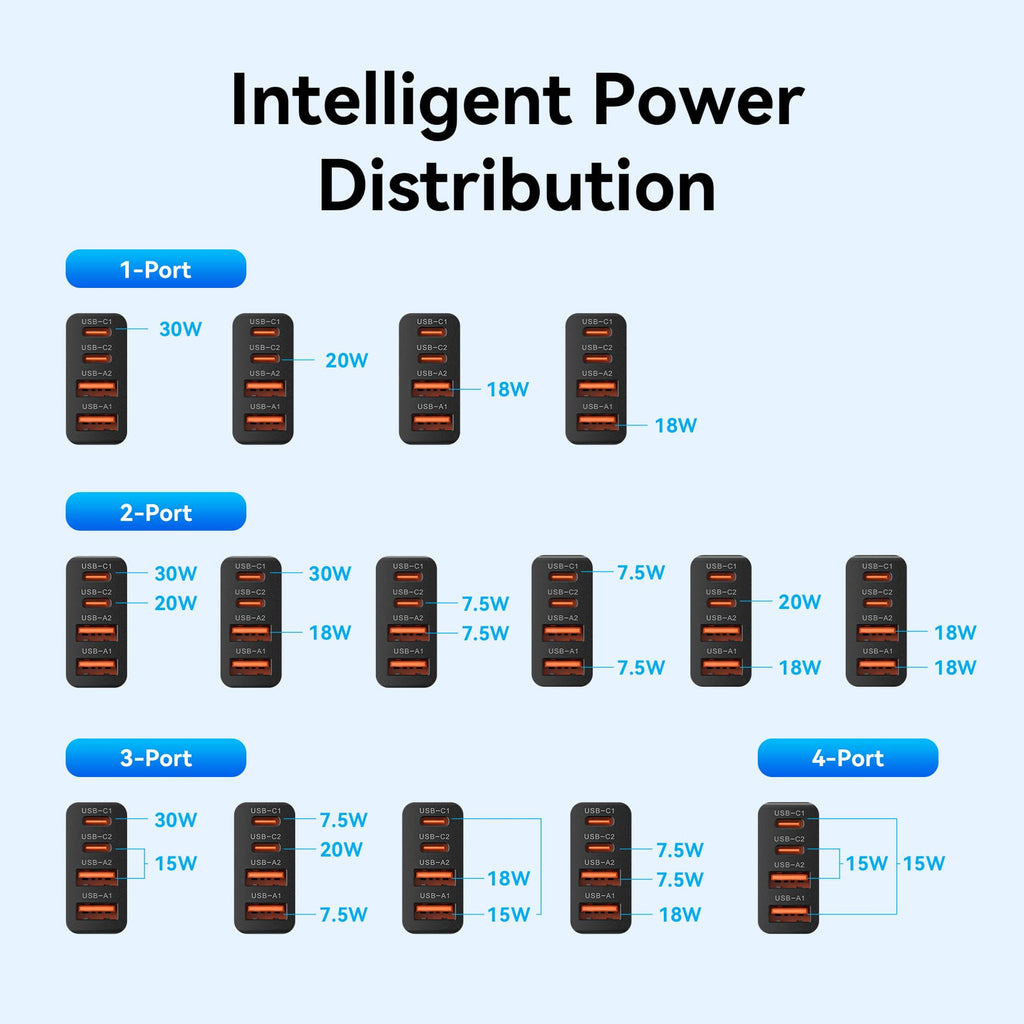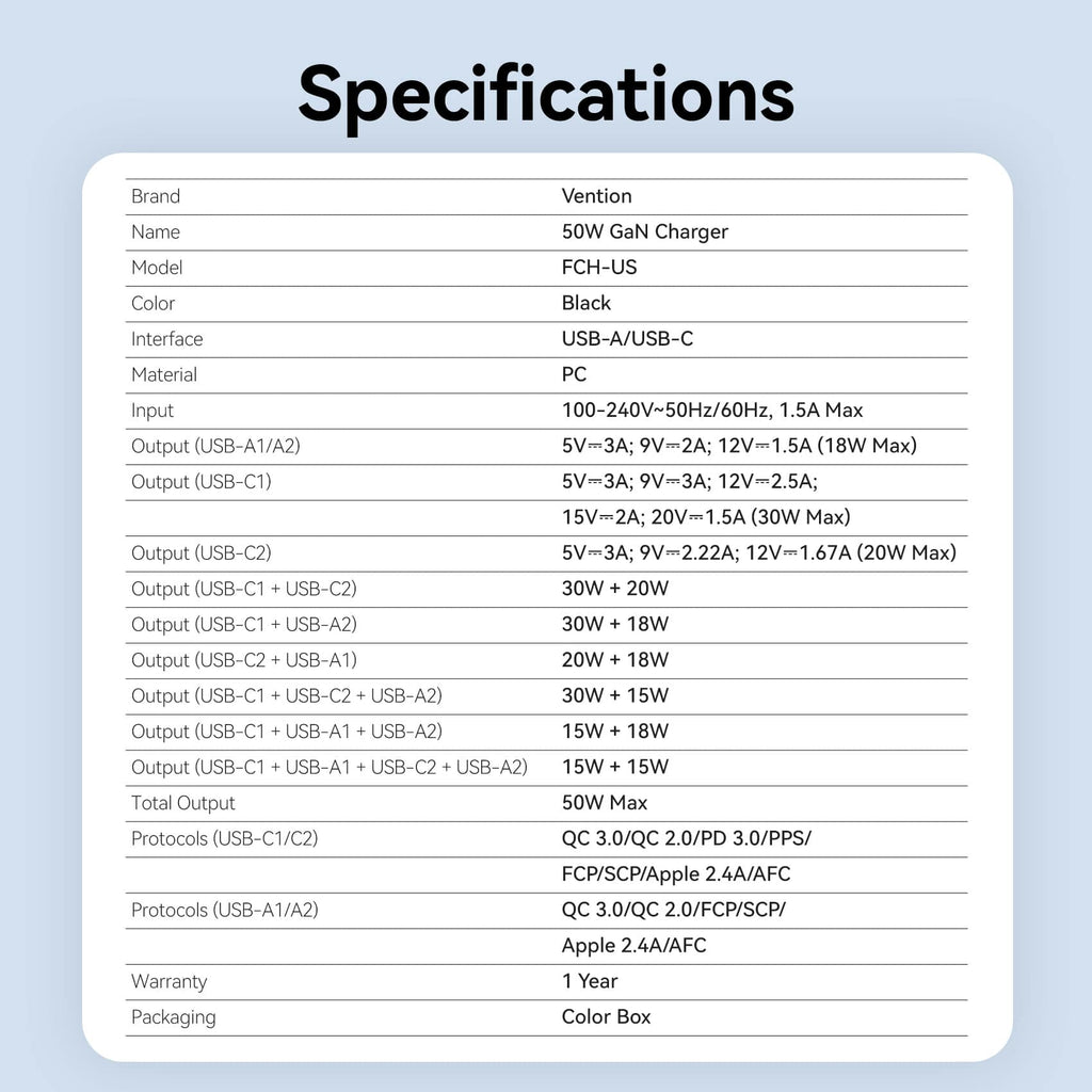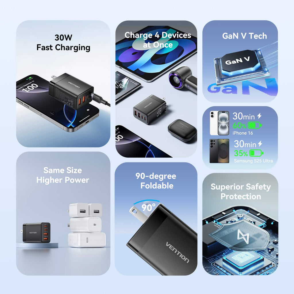 Vention 4-Port USB (C + C + A + A) GaN Charger (30W/20W/18W/18W) US Plug