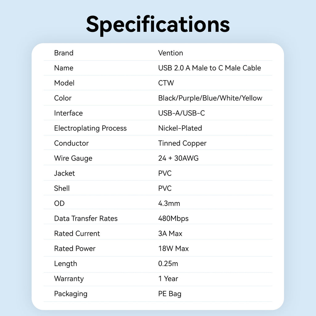 Vention USB 2.0 A Male to C Male 3A Cable PVC Type