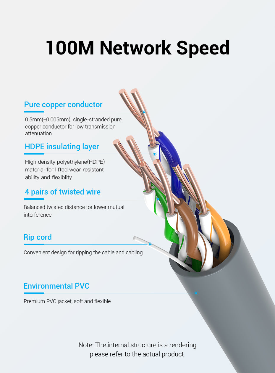 4-Pairs of Twisted Wire: Featuring four pairs of twisted wires with balanced twist distance, our Cat.5e cable minimizes mutual interference and crosstalk. This ensures a clean and stable signal, which is critical for maintaining high-speed data transfers and reducing connectivity issues.