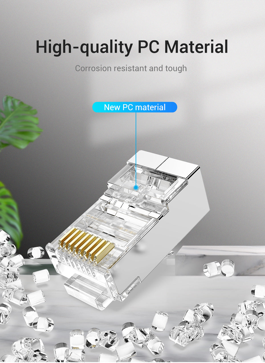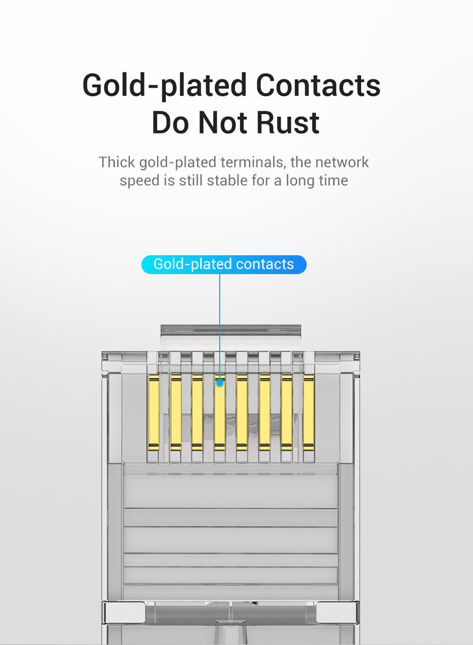 Gold-Plated Chips and Contacts: With high-quality gold-plated chips and contacts, this modular plug offers faster and stable transmission. The gold plating provides excellent conductivity, reducing signal loss and maintaining network speed over extended periods.