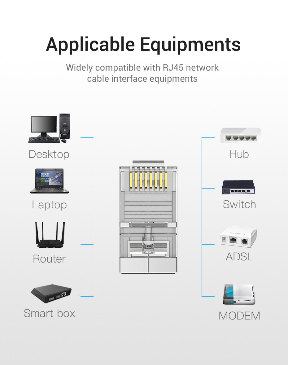 The Vention Cat.6 FTP RJ45 Modular Plug is widely compatible with various RJ45 network cable interface equipment, making it versatile and ready for any setup. This includes desktop and laptop computers, routers, modems, network switches, hubs, smart boxes, ADSL, and more. Its adaptability makes it a valuable addition to any professional or home network.
