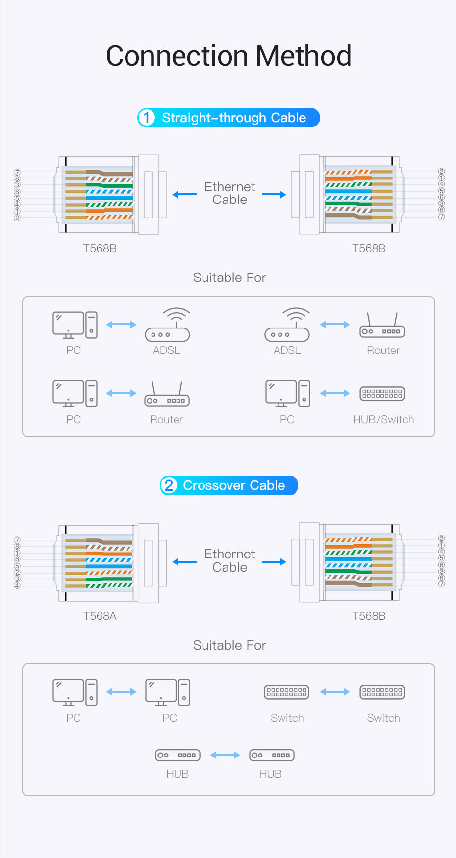 It supports both T568A and T568B connection standards for straight-through and crossover cable configurations. This versatility ensures ease of integration into your existing network infrastructure, making it convenient for various connection setups.