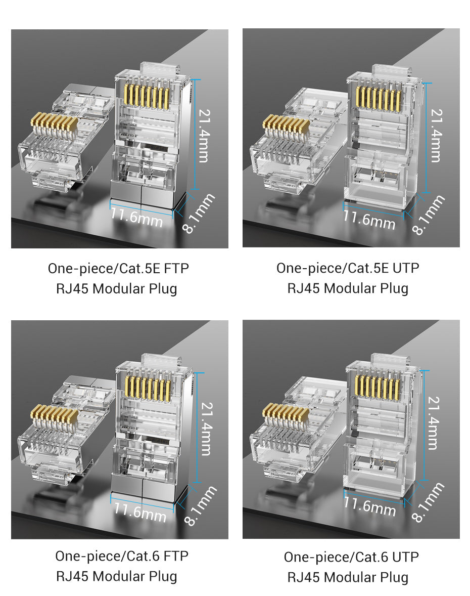 - One-piece/Cat.5E FTP RJ45 Modular Plug: 21.4mm x 11.6mm x 8.1mm