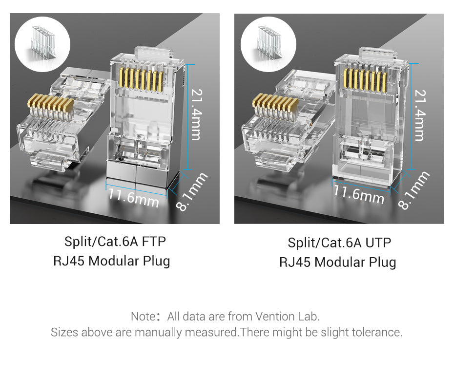 - One-piece/Cat.6 FTP RJ45 Modular Plug: 21.4mm x 11.6mm x 8.1mm