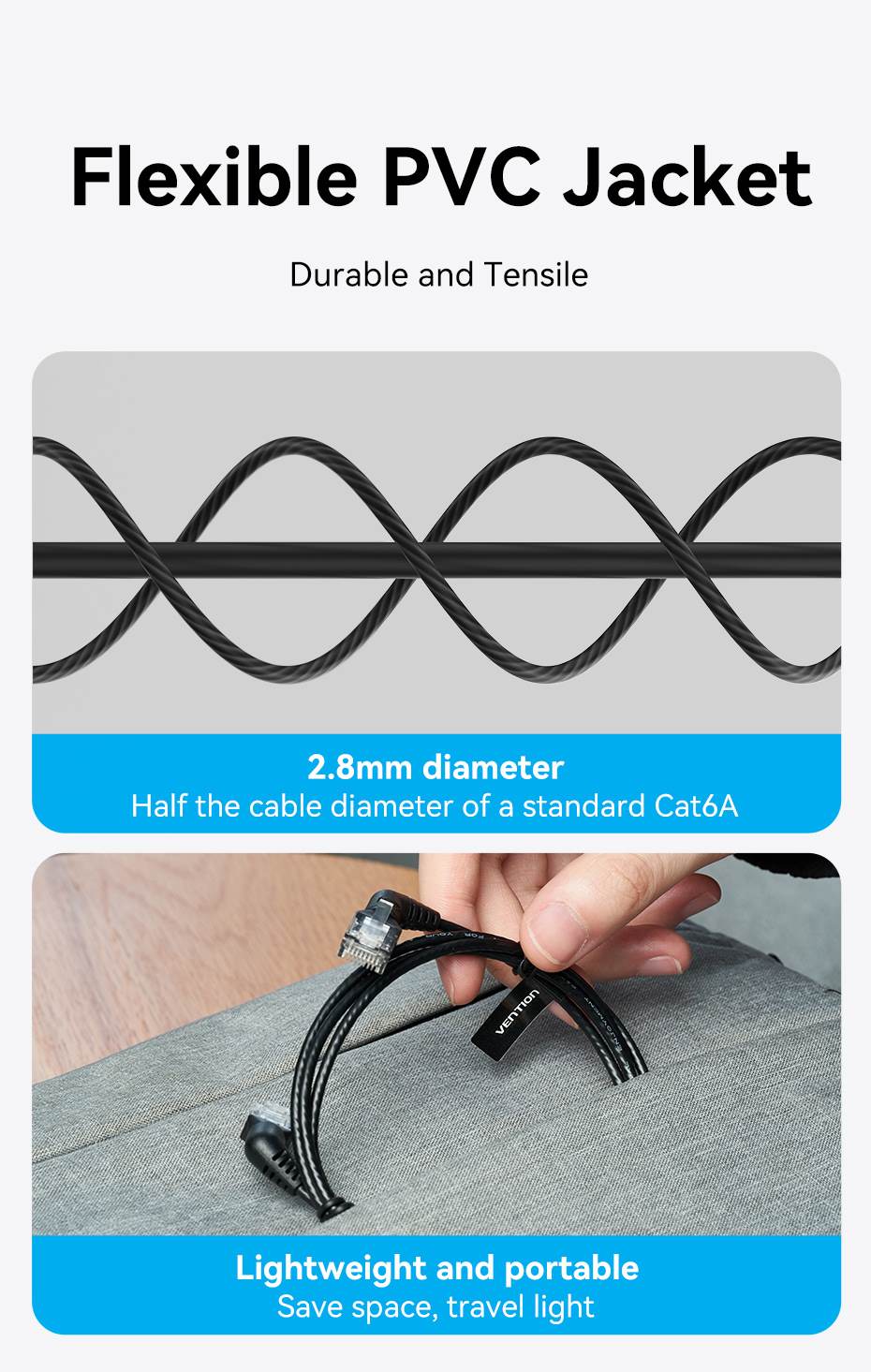 Along with durability, the flexible PVC jacket provides tensile strength, making it resistant to wear and tear. The 2.8mm diameter of the cable, which is half the size of a standard Cat6A cable, translates to lightweight portability that saves space and is ideal for travel.
