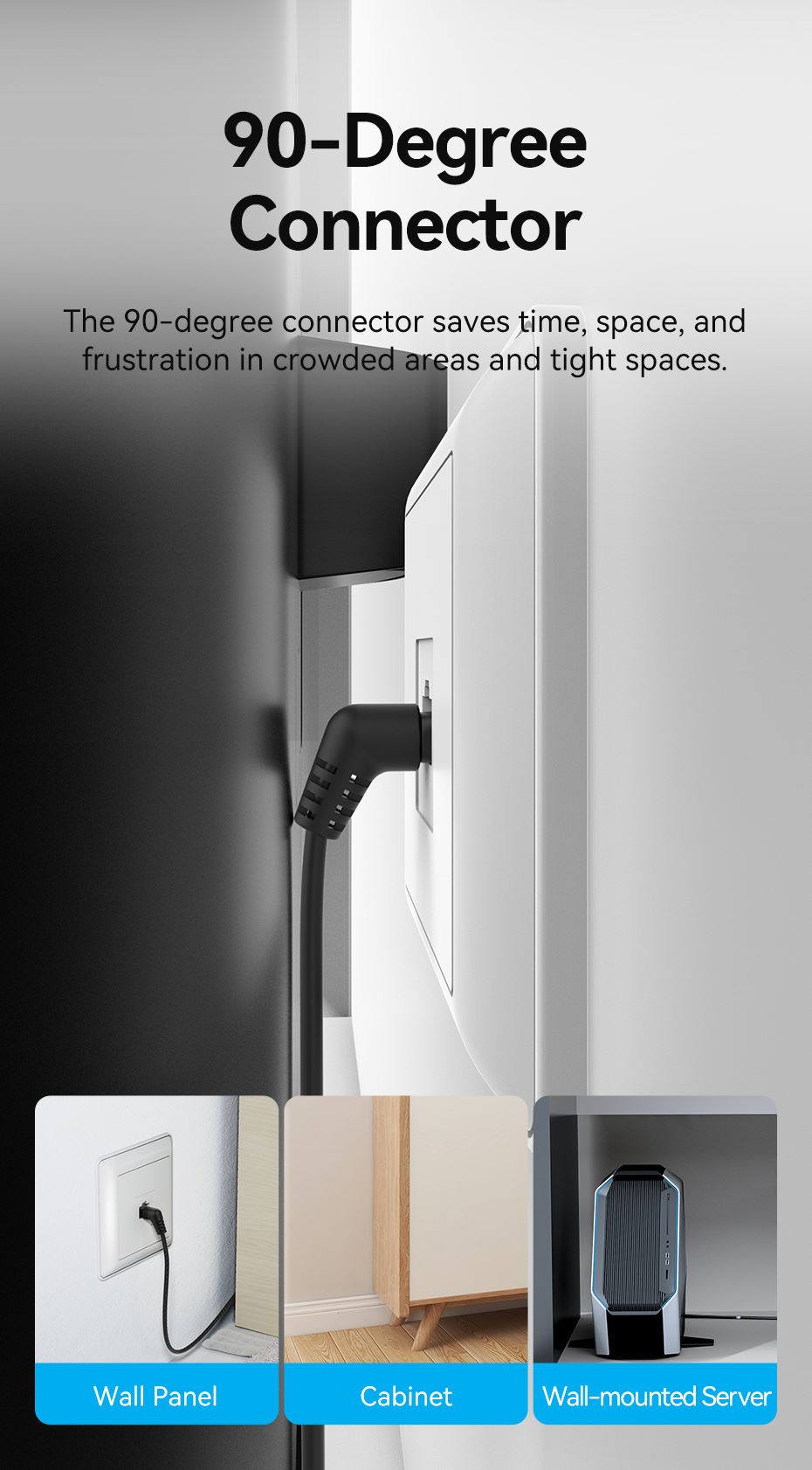 The Vention Cat6A Ethernet Cable features innovative 90-degree connectors that save time, space, and reduce frustration in crowded and confined areas. The flexibility of the rotated connectors provides versatility in connecting devices with different orientations or port locations, making it easier to manage connections in constrained environments such as wall panels, cabinets, and wall-mounted servers.