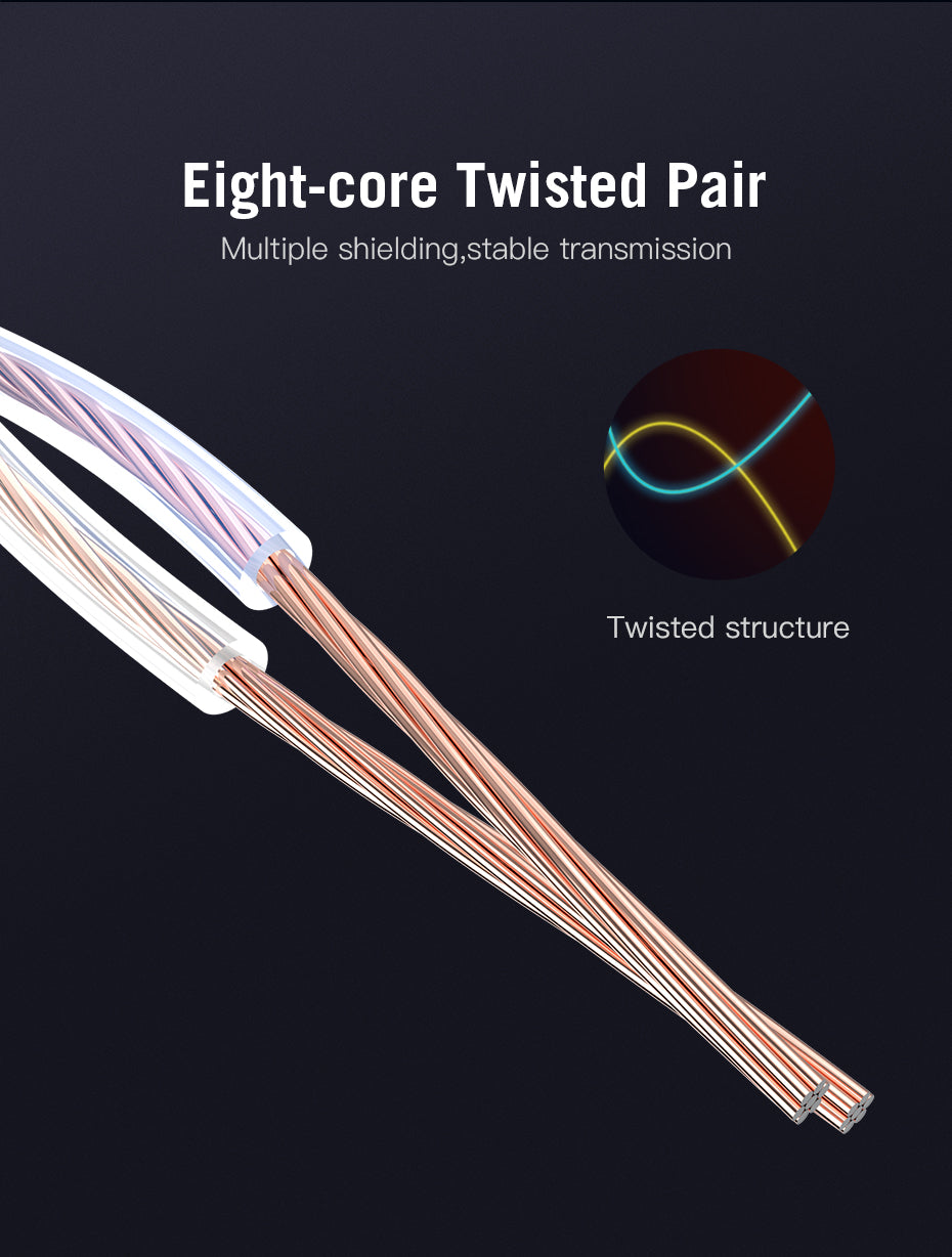 - 双绞线设计:八芯双绞线配置,多重屏蔽,最大限度地减少电磁干扰,保证信号传输稳定清晰。