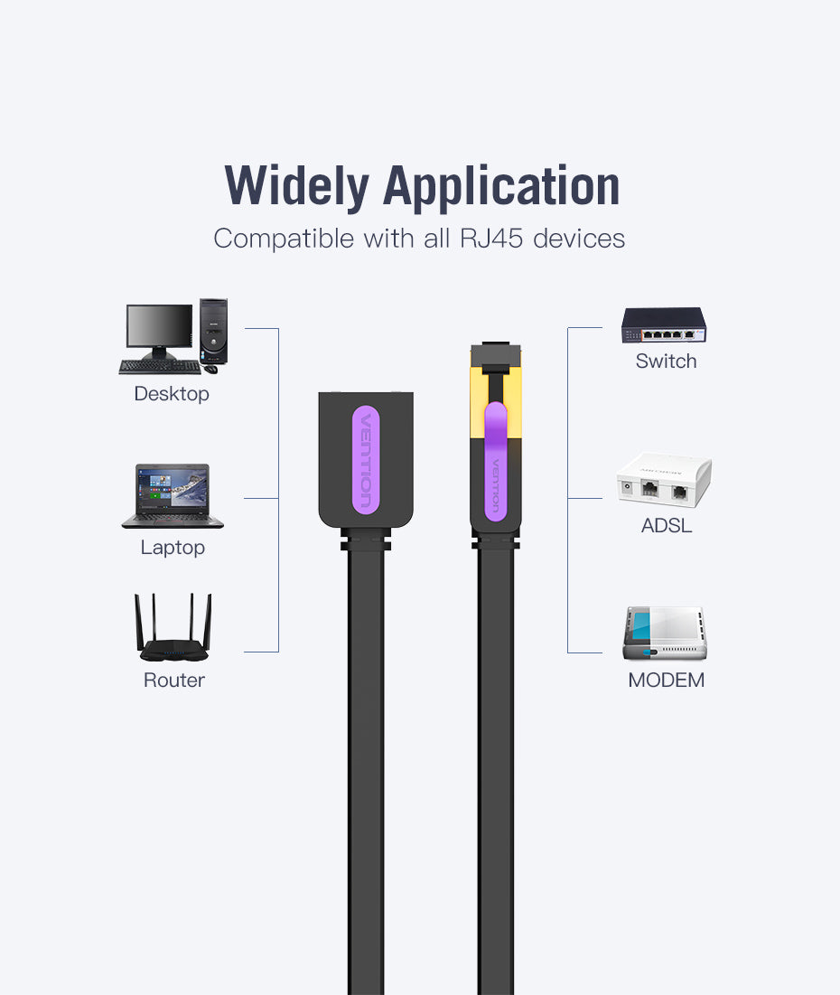 这 Vention Cat 7 以太网延长线兼容所有 RJ45 设备,包括台式机、笔记本电脑、路由器、交换机、ADSL 和调制解调器。这种广泛的兼容性确保您可以轻松地将现有的以太网连接扩展到家庭或办公室中的各种设备。