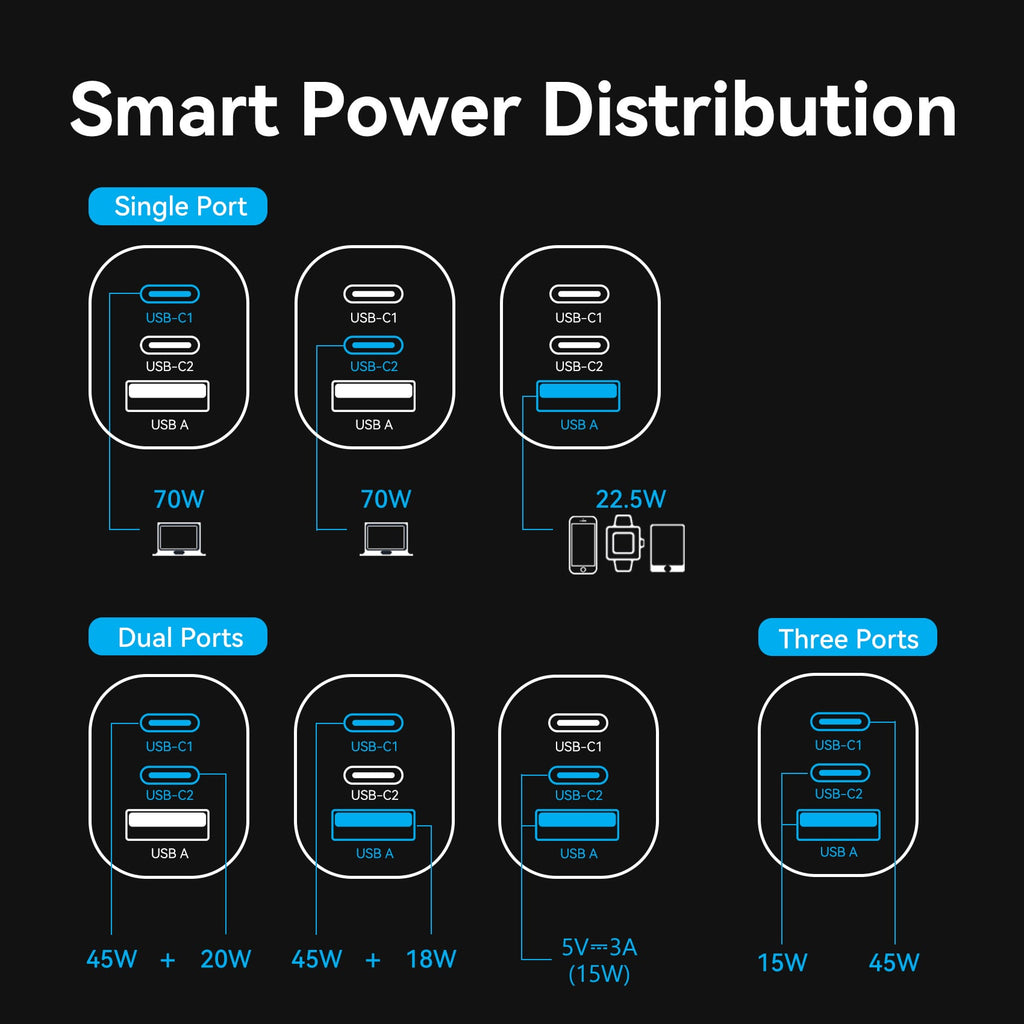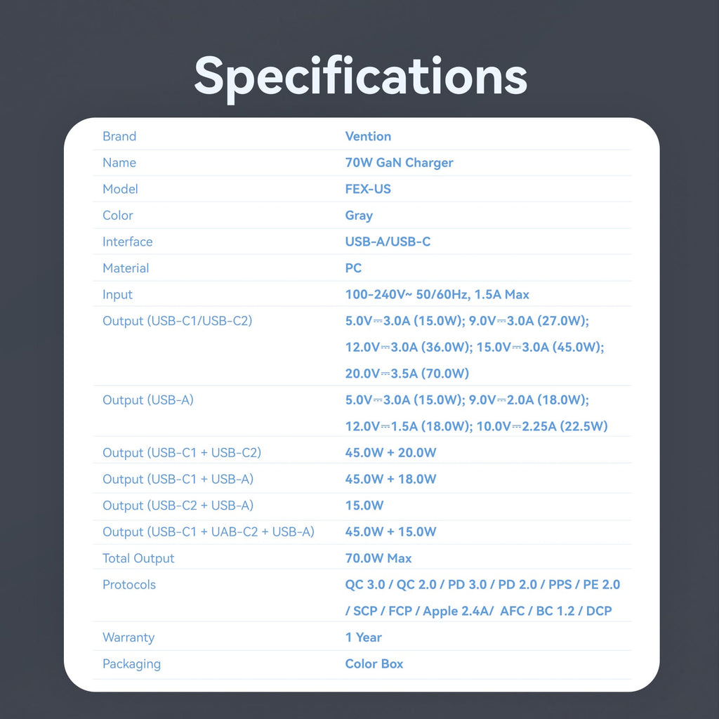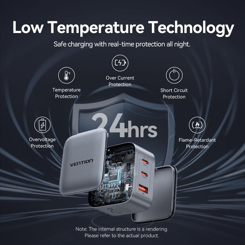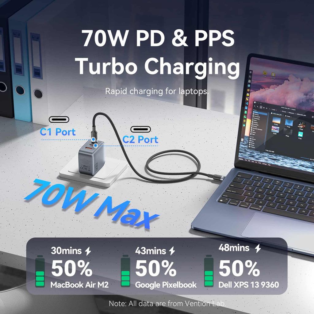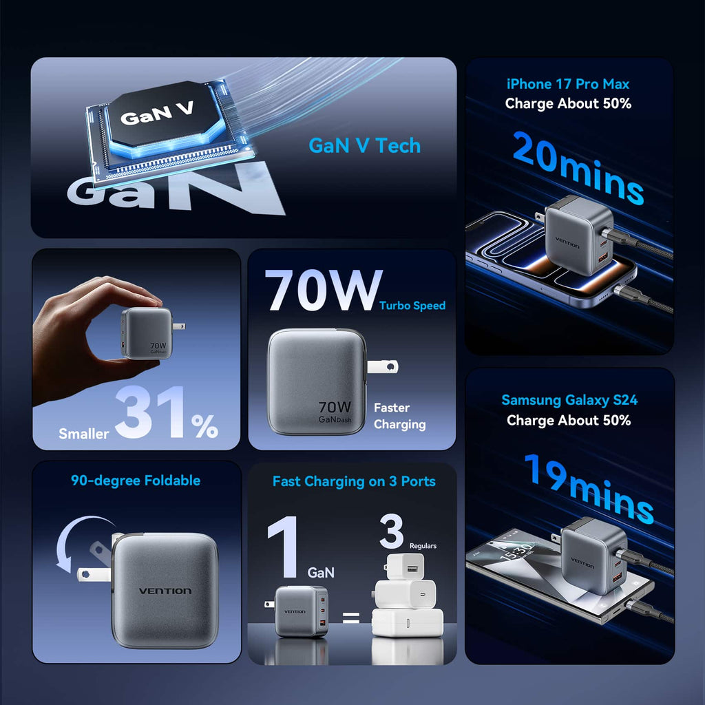Vention 3-Port USB (C+C+A) GaN Charger (70W/70W/22.5W) US-Plug Gray